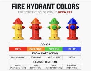 As per #NFPA 291 (Fire Flow Testing & Marking of Hydrants) the bonnet and outlet caps of hydrants are color-coded to indicate the available fire flow: